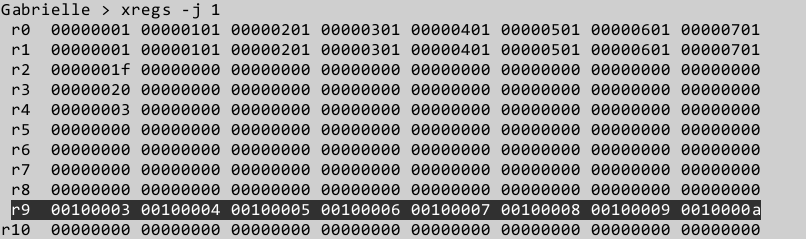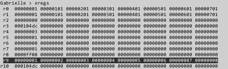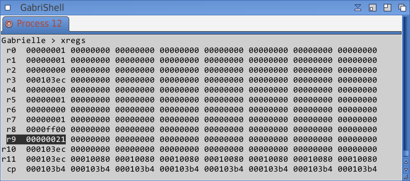 If we compile and execute this, we can with XRegs see what that r9 register holds.